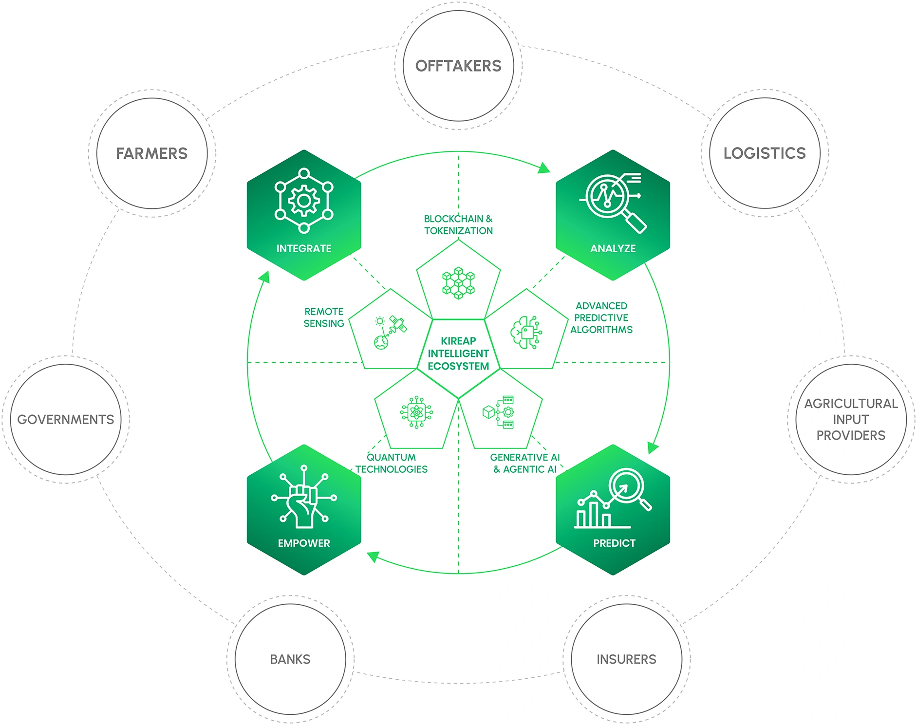 Democratizing and digitalizing the agriculture value chain end-to-end, KIREAP connects key value drivers by uniting farmers, off-takers, and logistics partners on a fully integrated platform. Powered by accurate bottom-up data, predictive algorithms, and AI advisory, our technology delivers measurable impact.